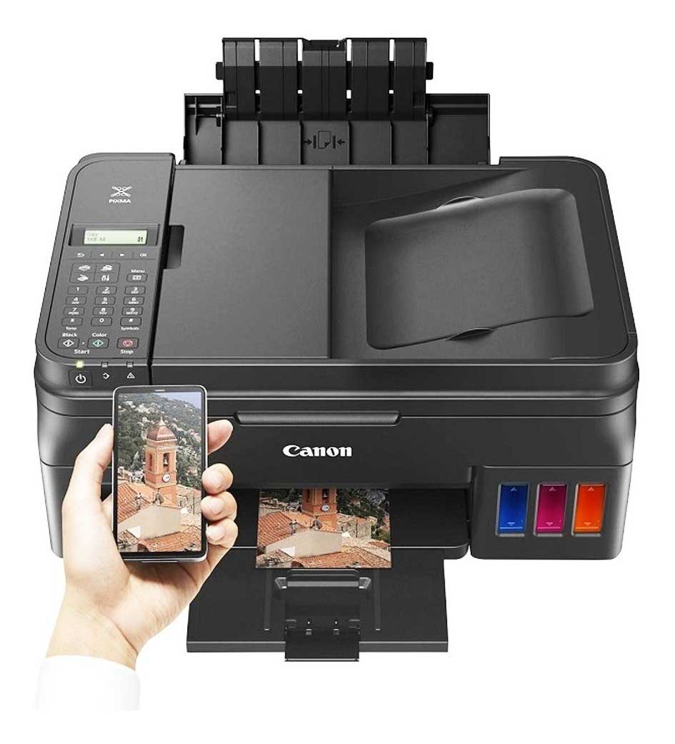 Multifuncional de tinta Canon Pixma G4111, imprime/escanea/copia/fax, Wi-Fi/USB 2.0 Imprime 8.8/5.0 ipm (negro/color) a 4800×1200 dpi, escaneo a 600×1200 dpi, copias hasta A4, fax hasta 33.6Kbps, bandeja de 100 hojas.