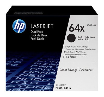 Los cartuchos de tóner HP 64XD Negro (Dual Pack) de código CC364XD cuentan con altos estándares de calidad de impresión y al mejor precio del mercado, recuerda que un cartucho que se encuentra en venta de tóner HP original cuentan con un chip original fabricada especialmente para contabilizar la cantidad de impresión de alta calidad que usted realice en su impresora.